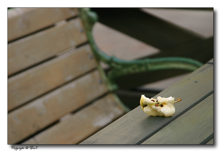 Non mi convince l'approccio al soggetto, con riferimento al punto di ripresa, troppo distante per essere un 'close up' di un torsolo di mela, troppo ravvicinato per mostrare un qualcosa del contesto che possa risultare piu' significativo di un particolare del tavolo e di una sedia/panchina...