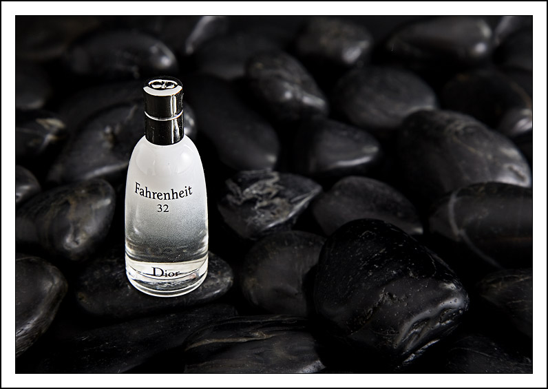 Nondimeno trovo suggestivo lo scenario di questi ciottoli di impenetrabile nerezza che contrastano la luminosità della bottiglia di profumo.