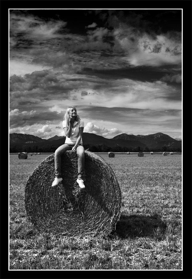 Sinceramente però non capisco cosa ci faccia una biondina con le scarpe immacolate, seduta su una enorma balla di fieno.