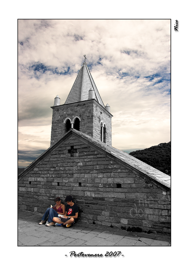 L'immagine è in sé un ottima composizione, niente da dire. Bei volumi. Soggetto importante, in questo caso la coppia di ragazzi. "Quinte" date dalla chiesa (o quello che è) che offre un ottimo scenario. Sfondo godibile con un bel cielo. Il problema è un altro, probabilmente nella postproduzione. Il campanile sembra incollato al cielo. Hai per caso selezionato e desaturato la pietra? Secondo me l'effetto finale sa troppo di artificiale.