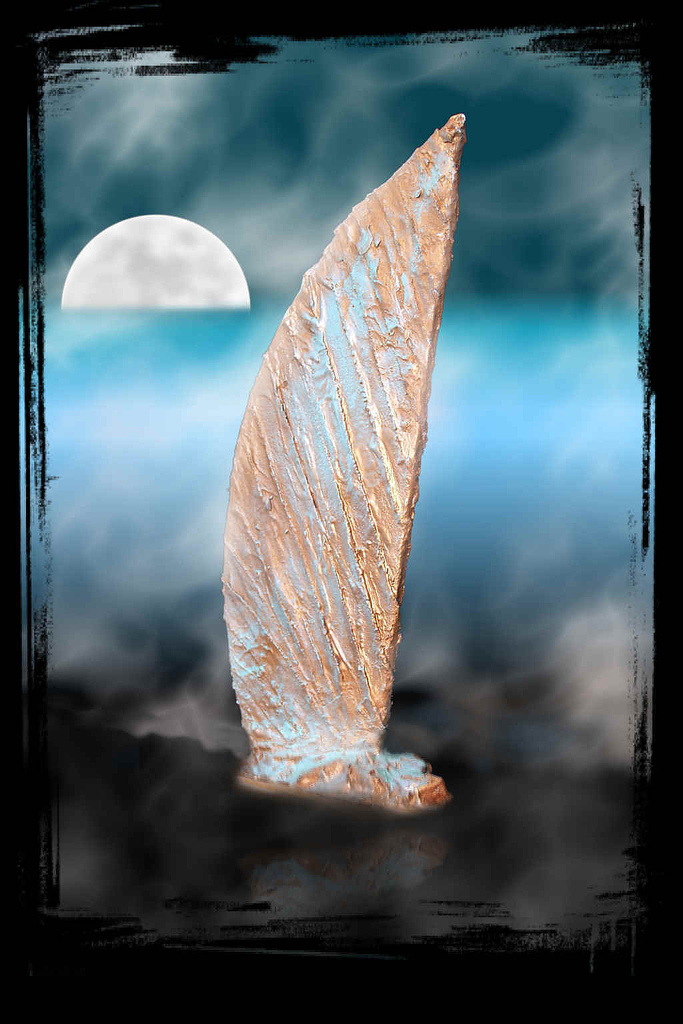 la lavorazione: ho effettuato foto in digitale su tavolo per still life con luci laterali posizionate. poi con fotoschioppe ho scontornato la vela; successivamente ho generato uno sfondo con il blu ed il nero, poi creato con il filtro nuvole le varie sfaccettature piccole pennellate(con il timbro) ed un po' di sfoca.