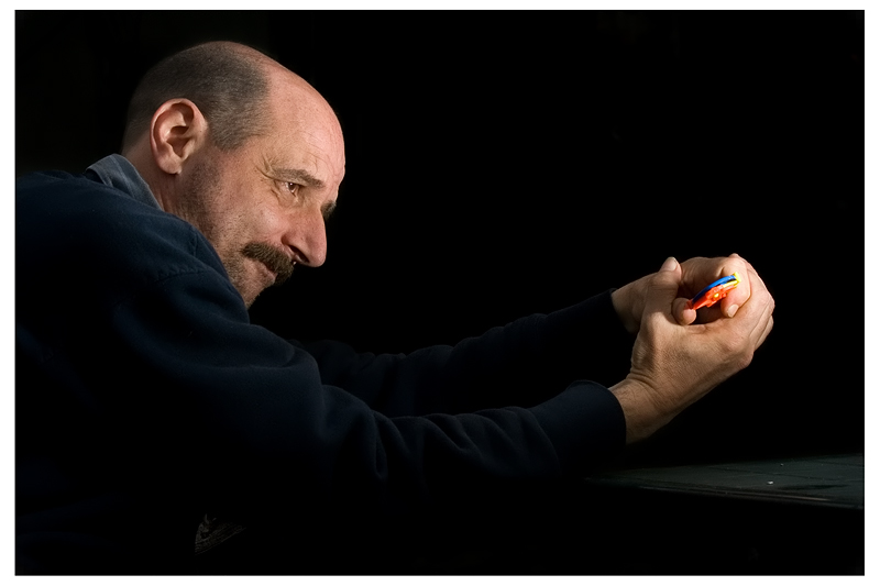 L'oggetto in mano colorato ti fa cercare di capire cosa sia e cosa l'uomo stia facendo(dal titolo suppongo giochi) lasciandoti però senza risposta. A parte questo io la trovo comunque molto bella, ottima luce e soprattutto l'incarnato è stupendo.