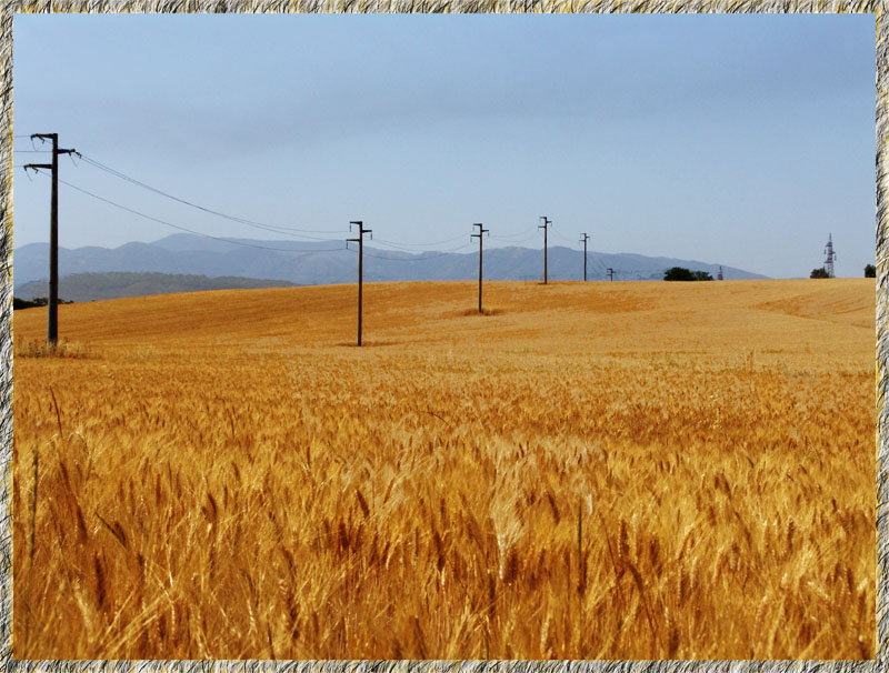 Per la foto proverei a tagliare la parte alta del cielo per fare partire i pali dalla diagonale, tanto e' abbastanza vuoto e perdi poco, in piu' metteresti in risalto il campo di grano altrimenti e' un po' dispersivo e non si sa dove guardare.