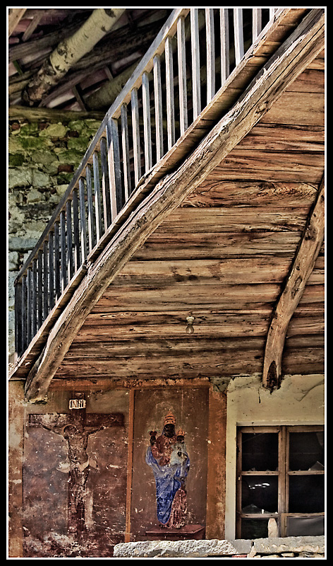 Bellissime queste immagini sacre nel nicchia lignea del sottoscala..... splendono quasi noncuranti dei segni del tempo e delle intemperie..... molto bella e con il tuo solito chiarore.....
