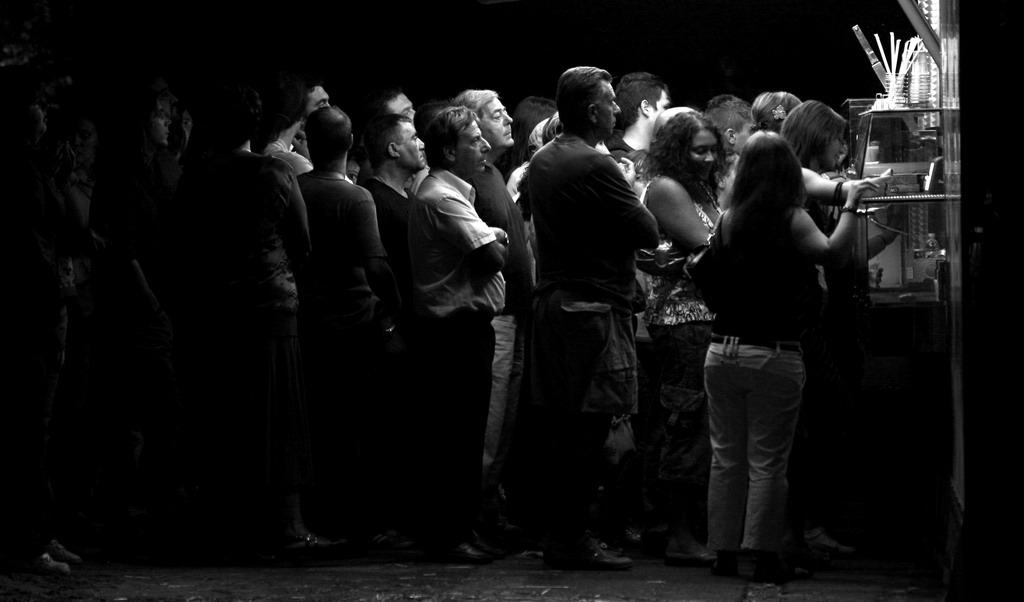 B/W semplice semplice ma che diventa una splendida panoramica di volti...L'illuminazione del chioschetto sui visi che pian piano si dilegua fa la sua parte... Wink