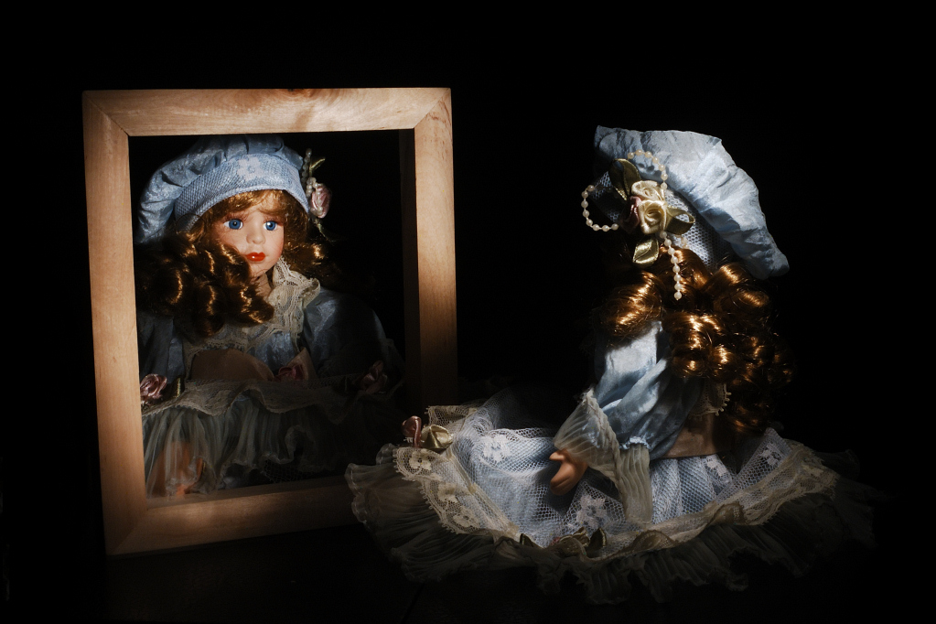 Sinceramente non ho fatto molti scatti per ottenere questo risultato (mi sembra di averne fatti 6 o 7) ma i primi li ho dovuti cestinare perchè solo quando ho scaricato le foto nel computer mi sono accorto che nella parte bassa della cornice (che avevo illuminato) quando spostavo la bambola si vedeva anche una parte della foto che non doveva vedersi, quindi ho dovuto rifarli ed evitare di illuminare la parte della cornice che stava dietro la bambola nel punto in cui le due parti della foto si sovrappongono.