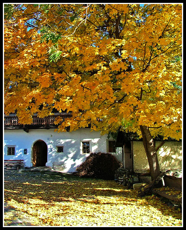Grande ricchezza di sfumature del giallo , non solo sull'albero , ma anche nell'ampia ombra che si proietta sul muro e sul terreno..... ottimo anche lo squarcio d'azzurro che lascia intuire il cielo, oltre le foglie......