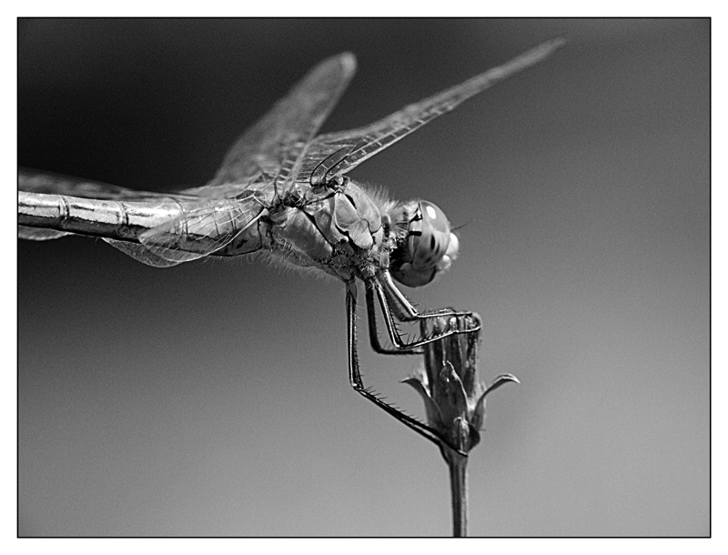 Penso che la sfumatura dello sfondo, così ben spartita dal corpo della libellula, sia proprio deliziosa e dia il meglio di sè proprio col biancoenero Ok!