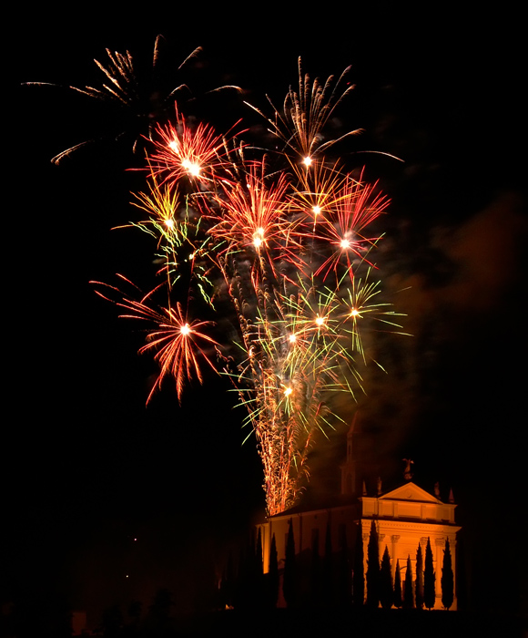 cavalletto, diaframma 8 tempo 2 secondi iso 80, da lontano ho cercato di inquadrare la chiesa e i fuochi.