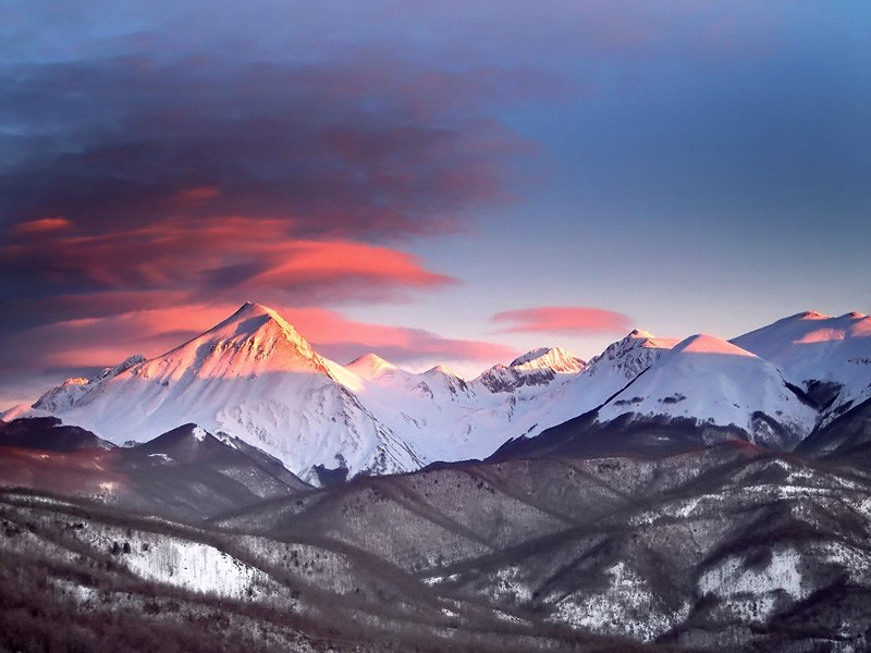 mi piaciono molto le cime illuminate n contrasto con i versanti innevati in ombra...bello il colore rosato...io ci vedrei molto bene un taglio panoramico..tagliando via una bella fetta di cielo...
