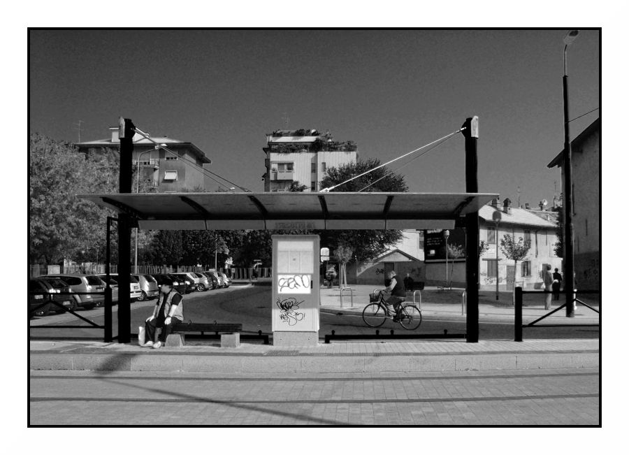 Un po' difficile riuscire ad identificare il centro di interesse in questa inquadratura così ampia, che finisce per includere troppi elementi disperdendo inevitabilmente l'attenzione. Il nucleo narrativo è in relatà costituito dalla sola parte centrale, cioè la pensilina, con la sua struttura simmetrica che incornicia a dx e a sx i due personaggi. La composizione avrebbe potuto più efficacemente essere costruita intorno a questi elementi, escludendo il cielo, i palazzi sullo sfondo e il lampione a dx.
