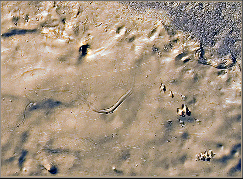 Ci si puo' vedere un corso arido di un fiume, rilievi montuosi, crateri e dune sabbiose oppure partendo da una scala differente, tracce di invertebrati, lombrichi. |