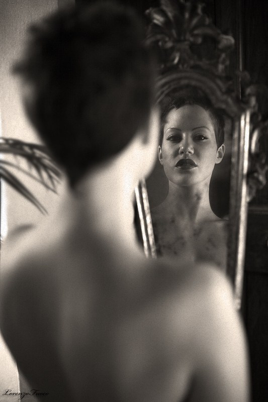 Buon BW... Avrei eliminato quei "rametti" che lambiscono il collo della modella ... Il primo piano sfocato.. sembra mosso eccessivamente... Lo scatto guadagna nel volto riflesso allo specchio ove si ha la sensazione davvero che si stia ponendo la domanda del titolo...