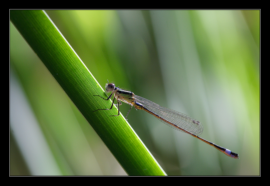 Bellissime le righe del posatoio. Trovo dal punto di vista della composizione molto bella visivamente la diversa inclinazione del posatoio e dello sfondo. Questo grafismo mette maggiormente in evidenza la damigella.