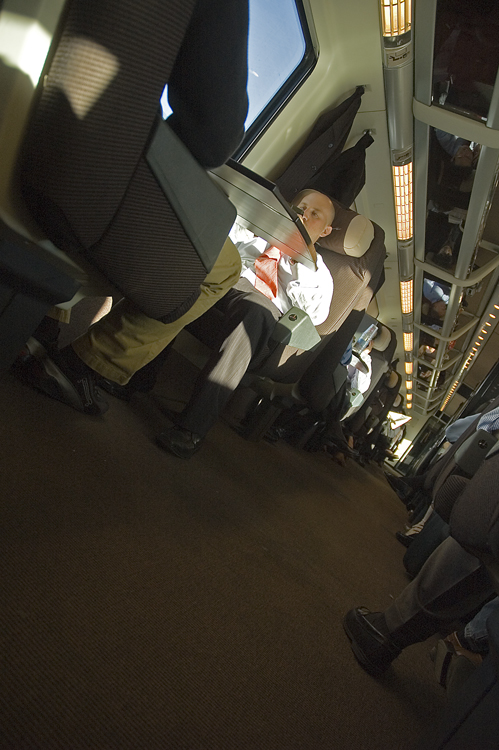Allora l'imbottitura delle poltrone, i tessuti freschi di stiratura, il rumore ritmico del treno e i rapidi giochi di luce creati dai finestrini assumono un altro spessore... e quello che in effetti è banalità trasuda lentamente dall'immagine.