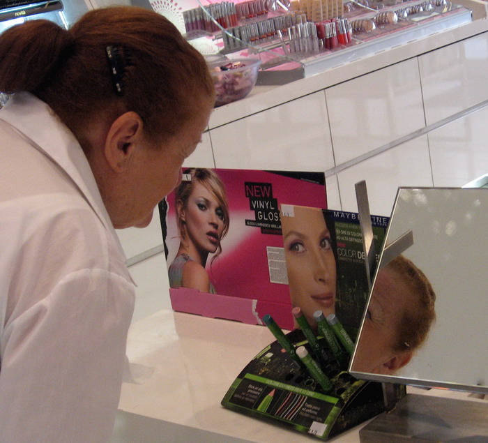 L'idea è molto carina, però parere personale la trovo trascurata in post produzione. E' sottoesposta e c'è poco contrasto. Inoltre sarebbe stata una ciliegina l'occhio riflesso nello specchio(ma so che avrai avuto una frazione di secondo per scattare) oppure inquadrare un pò di più il volto per vedere lo sguardo concentrato della signora.