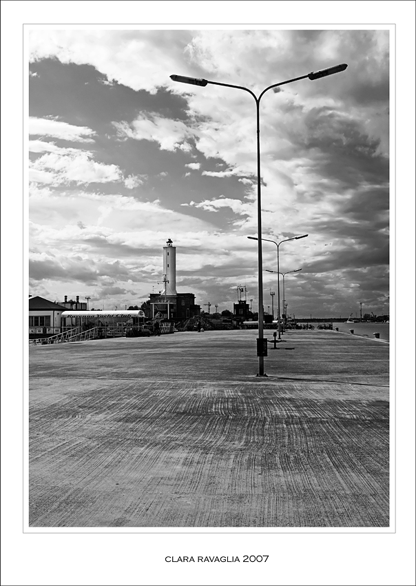Non c'è neanche la "tua" campagna, non ci sono i tuoi colori ma anche questa foto è piena di "Claritudine". C'è la tua prospettiva, c'è la tua capacità di raccontare gli spazi. Bello il susseguirsi di linee verticali, bella la contrapposizione tra l'aridità dell'asfalto (che hai fatto bene a tenere così presente in primo piano) e la sontuosità del cielo. Bellissimo il biancoenero. Mi piace molto.