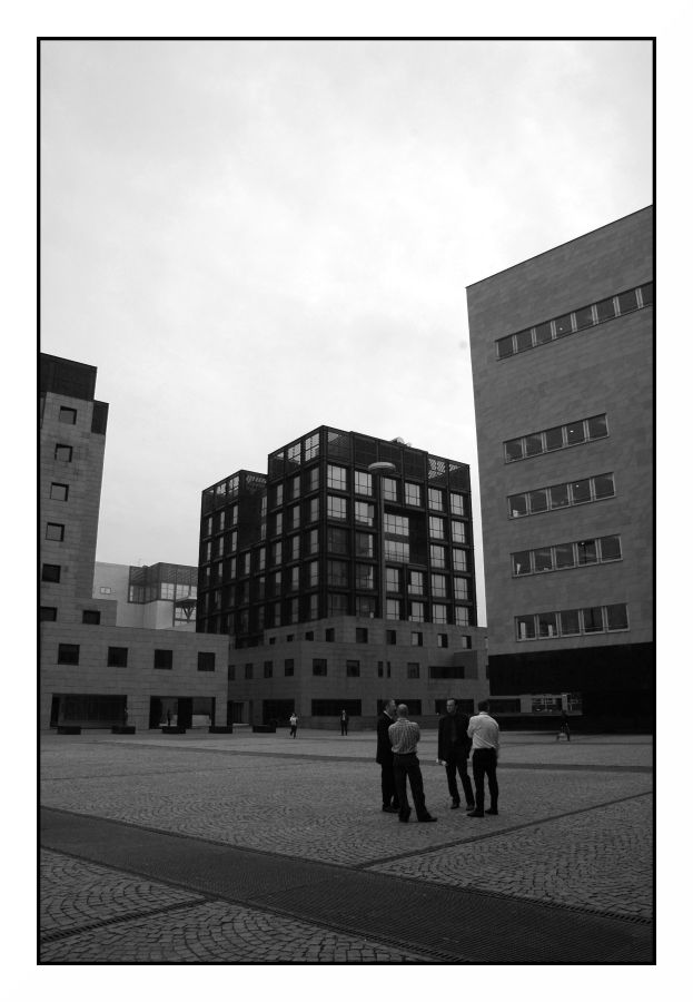 Il gruppetto di persone contrasta un po' con l'atmosfera evocata dell'architettura.