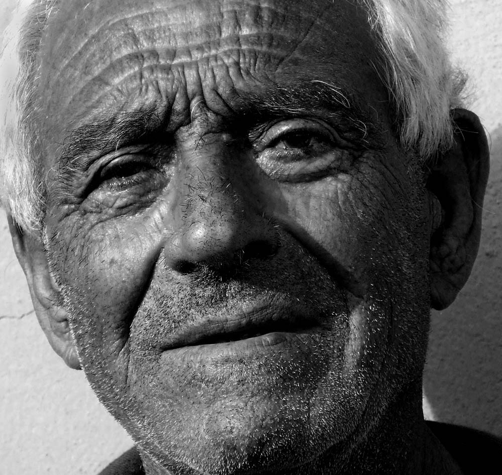 Forte espressività, complice la "tessitura" della pelle scavata, piena di rughe; la barba ispida; una pella che racconta insomma, ... e che rievoca nell'immaginario di tutti una vita vissuta, di lavoro, di sana esperienza.