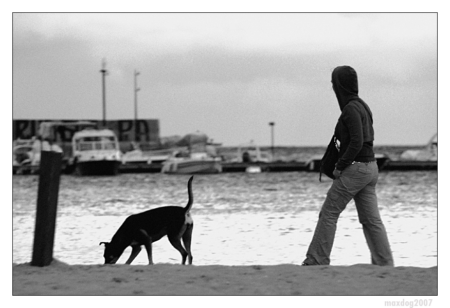 Il titolo nasce dal fatto che questa ragazza vagava per la spiaggia, e la cagnolina si è messa a camminarle due metri avanti, fermandosi anche lei ad ogni sosta che la ragazza faceva...