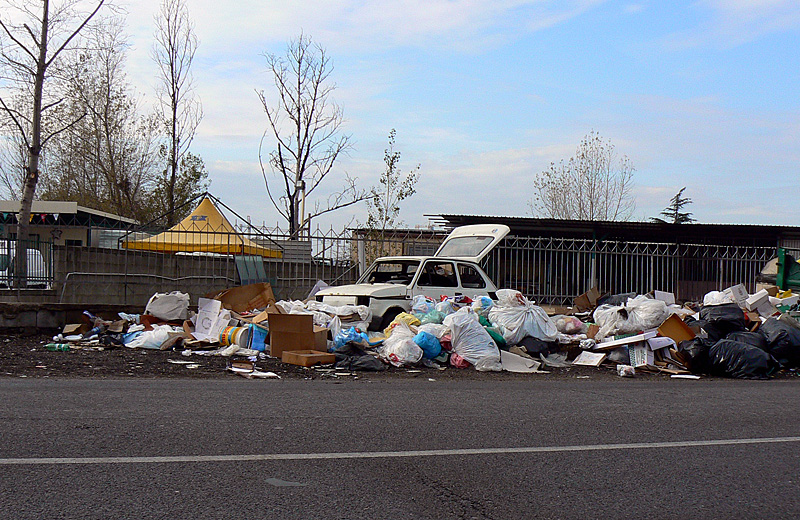 Nella mia galleria ho già postato una foto nella quale c'era rappresentata una vettura con il vetro rotto e, approfittandone, i condomini di un palazzzo l'avevano riempita di buste d'immondizia. Ma questa volta si sono superati, addirittura ho scoperto una vettura gettata nei bidoni dell'immondizia.