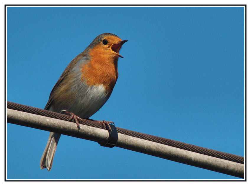| Un simpatico pettirosso, sui fili del telefono davanti casa mia, cantava a squarciagola tutto contento! |
