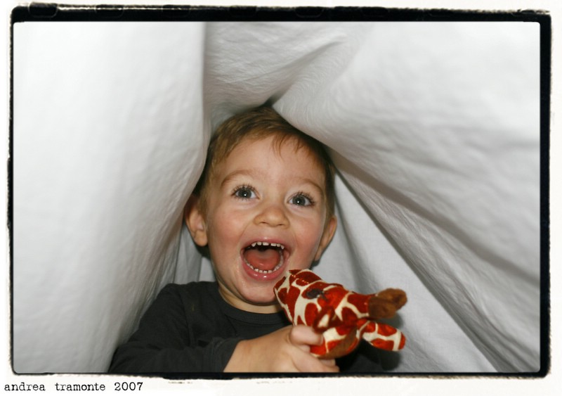 Una foto scattata sotto il lenzuolo in cui si era nascosto mio figlio Alessandro, usando il flash della macchina.