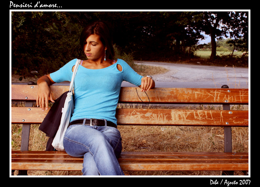 Questa secondo me che l'ho scattata non rappresenta una bella foto, la sto inserendo unicamente allo scopo di comprendere meglio se il tipo di trasformazione che ho applicato con photoshop rappresenti un qualcosa di buono oppure no. In particolare la mia intenzione è stata quella realizzare una foto che parlasse d'amore. In primis il soggetto è la mia ragazza, quindi niente di più azzeccato. Come seconda cosa c'è la panchina dove gli innamorati hanno inciso varie scritte e come terza ed ultima cosa ho voluto far virare l'immagine verso un color rosso-arancio per rendere ancora più visibile l'espressione di sentimento. Vorrei capire se ho fatto un buon lavoro oppure no e vorrei tanti.. tantissimi consigli perché a me fare foto piace troppo! Grazie a tutti _________________ "C'è una notevole differenza tra una bella fotografia e una fotografia con un bel soggetto. Quando avrete capito tale differenza, avrete capito la vita" (Debe) |