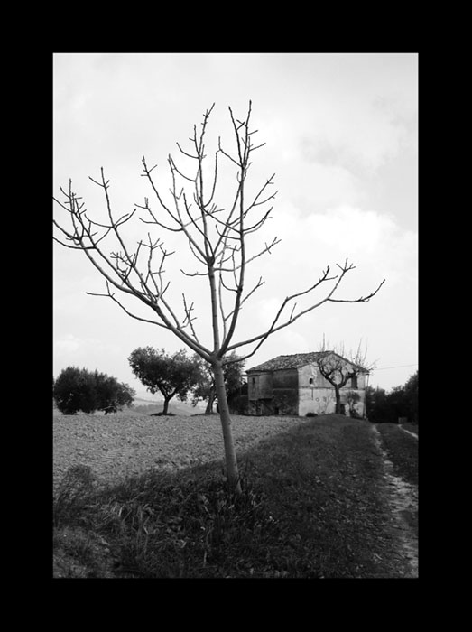 Ma lo sai che io lo vedo come un paesaggio dell'anima questo tuo piccolo scorcio, piccolo nella dimensioni, ma a ampio nella sostanza emotiva... mi commuove quel contrasto silenzioso fra le chiome d'albero rigogliose dello sfondo e i rami sottili e spogli del primo piano, il silenzio della campagna, la solitudine buona del casolare...... la non tinta del cielo quasi una rappresentazione verista di una coltre celeste anonima e sincera in una giornata qualsiasi.