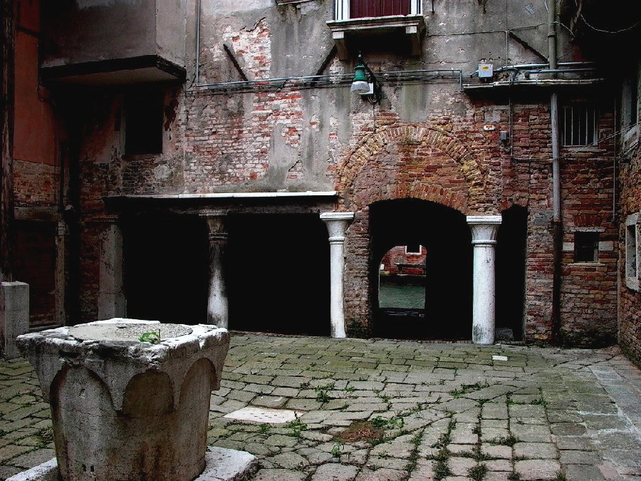 ti strozzerei... Mi arrabbio? per non aver completamente incluso il pozzo nella inquadratura...... per il resto la foto è perfetta.... solcata da una luce strana.. direi quasi misteriosa... soffusa ma nello stesso tempo intensa a sufficienza per dare un risalto perfetto alla materia dei mattoni, dei legni delle strutture... I tubi in metallo che scorrono rettilinei lungo le pareti non mi disturbano più di tanto... fanno parte di questa realtà , il colore forse del verderame che li avvolge raggiunge la lampada e fa il paio con i ciuffi d'erba e il muschio delle piastre del pavimento, attraversate da chiazze di colore......