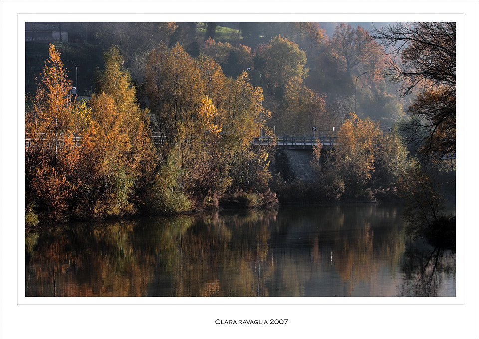 Immagine fiabesca.... i colori caldi dell'autunno e la leggera foschia a destra che sembra andarsene piano piano per svelare la bellezza della natura che si sta per addormentare. E le calme acque che fanno da specchio a questo quadro ne accentuano l'intensità.