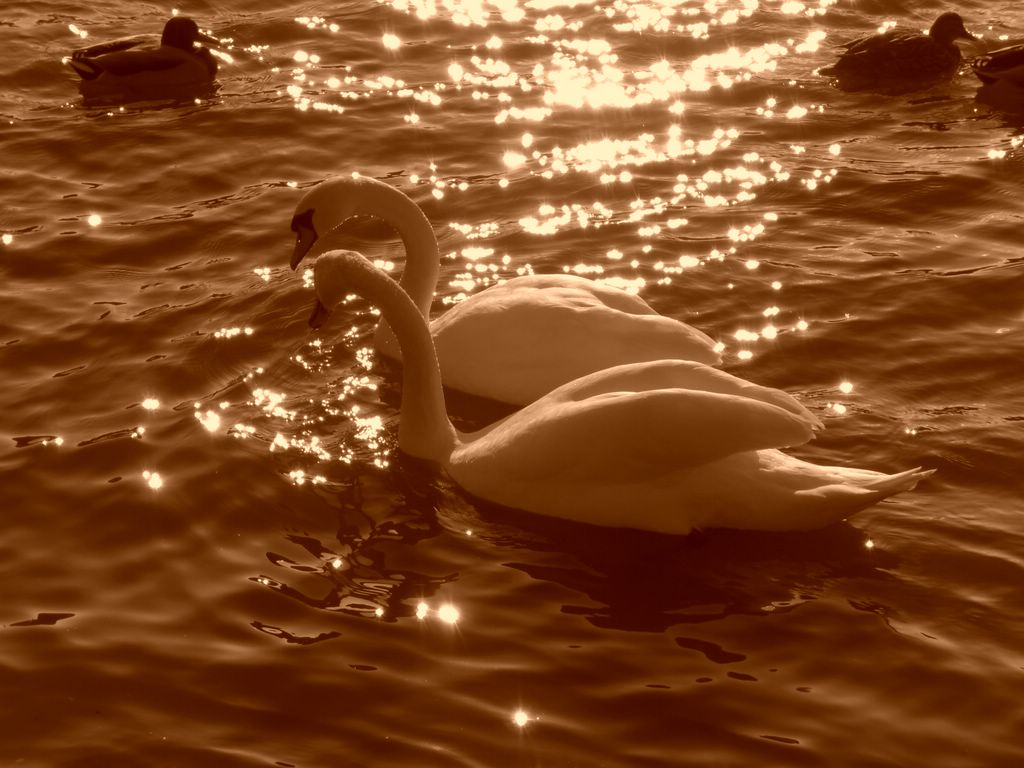 Bellissimi i riflessi di luce sull'acqua. Forse avrei tagliato le anatrelle in SP, anche se, ai fini del titolo, sottolineano per contrasto lo stare insieme dei due cigni in PP.