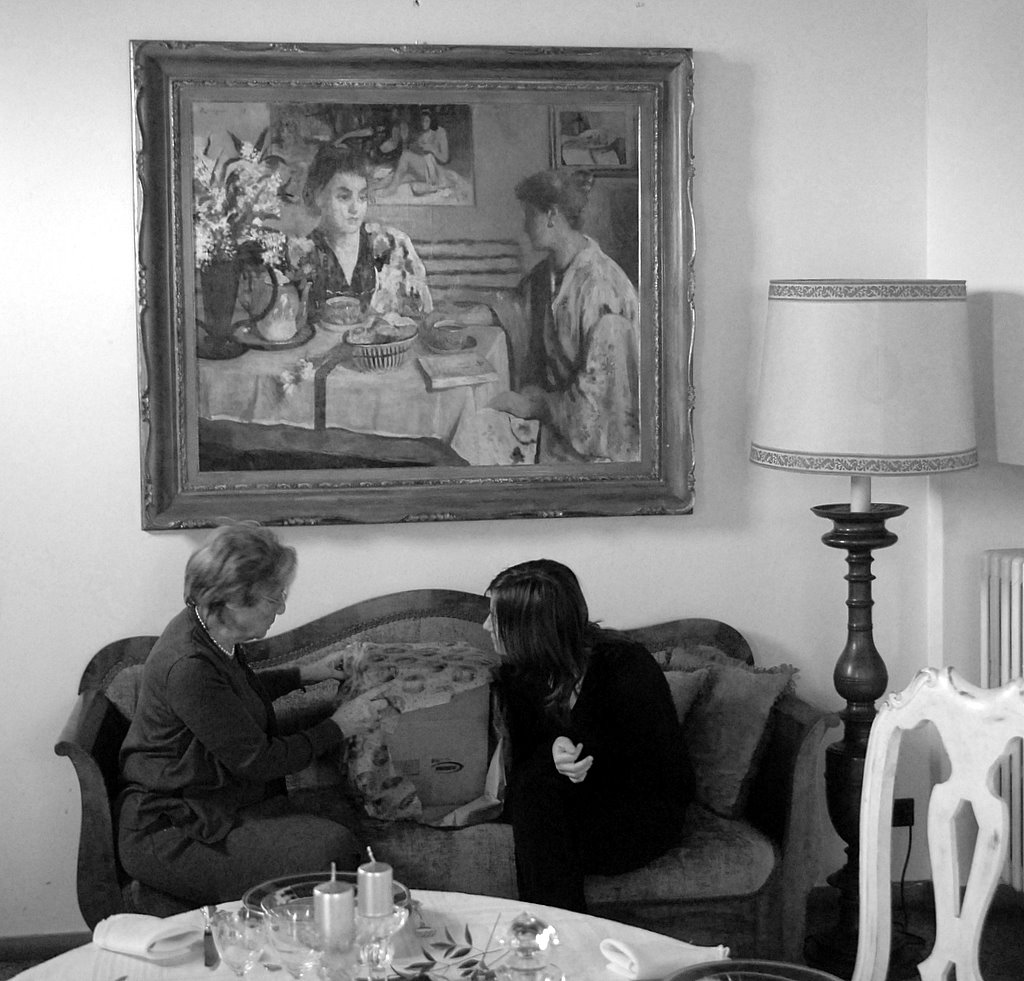 | Si, la scena dove le donne in baso sedute sul divano imitano il gesto del quadro appeso alla parete ha il suo buon effetto. Anche il bianco e nero che contiene molto sfumature di grigio, regge. Nel complesso mi sembra una foto "pensata" e riuscita. Onaizit8 |