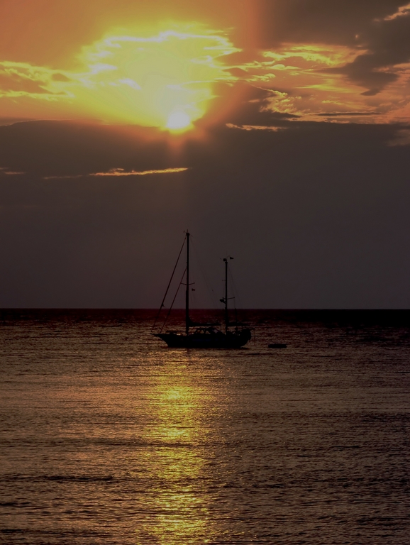 Bellissima scena impreziosita dai colori spettacolari del crepuscolo. Per rendere leggermente più dinamica la foto avrei evitato di posizionare al centro sia la vela che l'orizzonte.