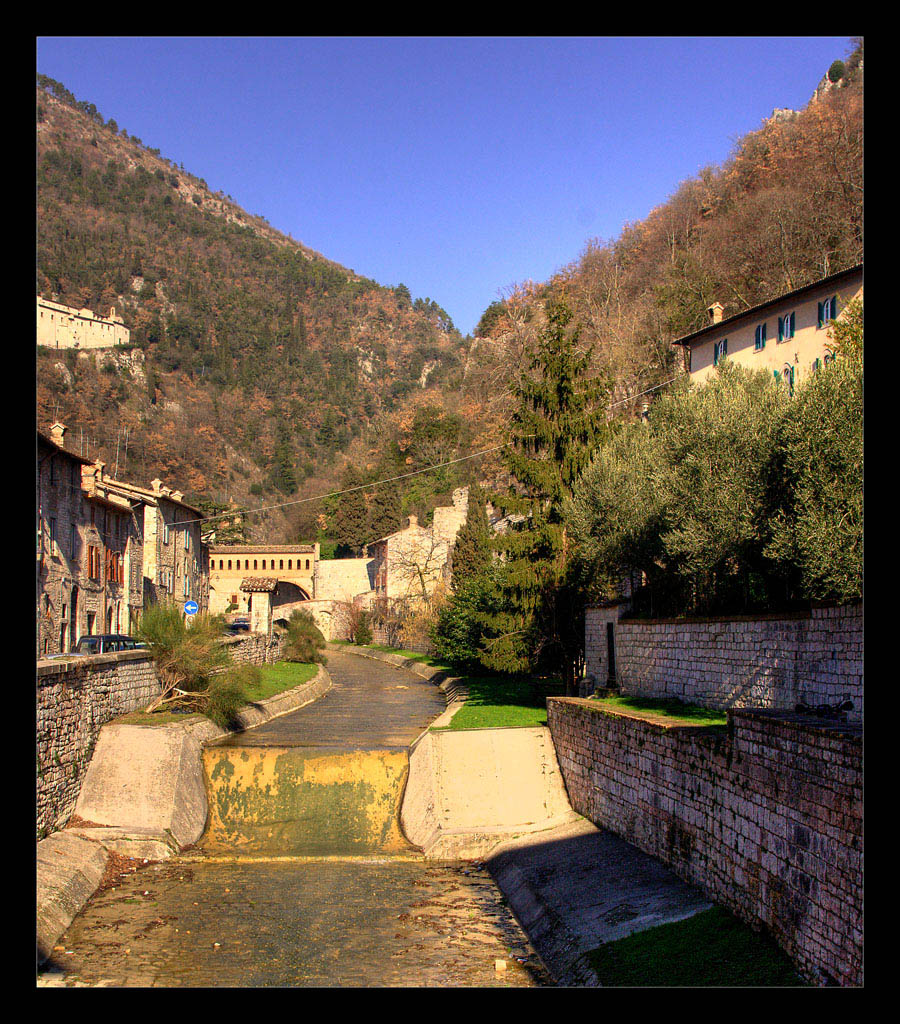 La composizione è equilibrata,come pure il taglio adeguato.Quello che non va sono i colori che subiscono sicuramente un bilanciamento non corretto,ci sono parecchie,anche se leggere,sovraesposizioni sugli edifici e sul letto in cemento del torrente a dx.