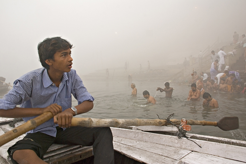 Un'immagine in cui anche i più piccoli dettagli raccontano (l'orologio del ragazzo, la sua gamba scoperta, il sistema di fissaggio del remo alla barca, il fedele che getta l'acqua nel fiume...).