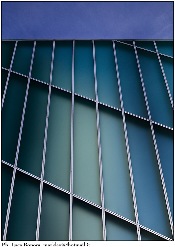 Bello il gioco della luce che accende la parte centrale della struttura, e poi si trasforma in un blu più intenso, prima di arrivare al bordo e a spingerci a saltare nel cielo.. con il gioco della linea obliqua che taglia quelle verticale, si ha l'illusione ottica che quella linea orizzontale in alto sia storta, invece è perfetta..