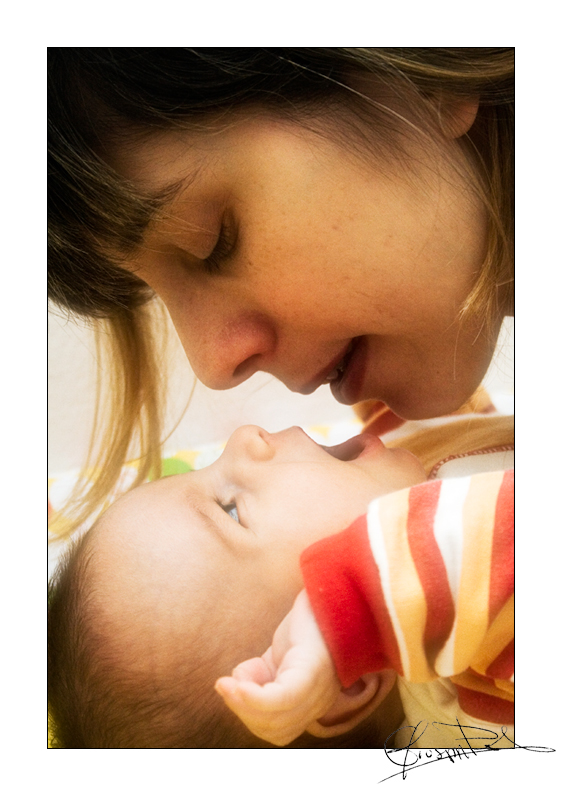 Il dolce incombere dell'adulto è inoltre stupendamente sottolineato da un particolare che mi ha molto colpito, forse perchè legato a ricordi dell'infanzia e dell'adolescenza: la ciocca di capelli, morbidamente resa dallo sfuocato, quasi ad accentuarne la delicata fisicità, che si riversano sulla fronte del neonato.