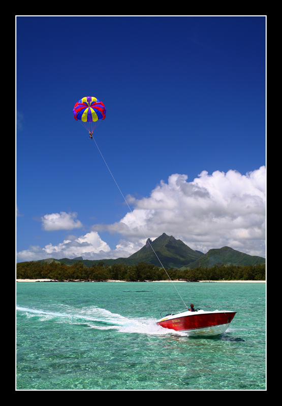 Immagine davvero ben gestita, in tutto, bella nei colori, brillanti, bella nella luce, intensa ma mai eccessiva, bella nell'inquadratura verticale che cattura motoscafo, uomo in volo, e sfondo in una maniera elegante e senza risultare mai approssimativa..