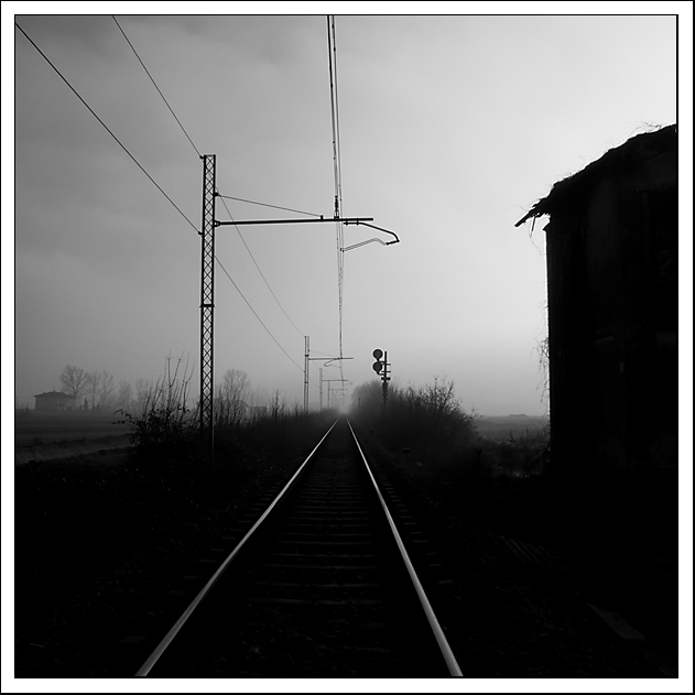 davvero molto incisiva, molto bello il bianconero molto marcato con pochi grigi intermedi, un nero molto intenso tagliato dai binari lucidissimi, ed un cielo nebbioso interrotto dai fili neri. Molto evocativa e potente l'immagine, e direi anche con un'ottima nitidezza e chiarezza "espositiva" dell'autore!  _________________ www.pbase.com/marcocelio |