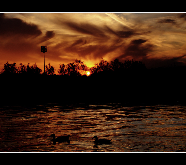 La serena passeggiata acquatica delle due paperelle si accompagna ad uno sfondo cupo, dove la luce morente del sole è più un monito bruciante che lo spegnersi sereno del calore diurno...