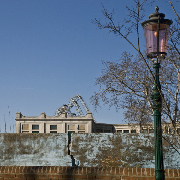 quella crepa sembra quasi indicare che la divisione dei due "mondi" ( quello dell'abbandono e della precarieta del fabbricato industriale e delle gru -?- e quello della cura e della compostezza del lampione ) sia estremamente provvisoria e destinata a venire meno