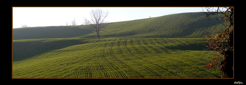 Non sempre si ha il tempo di aspettare la luce migliore...ma hai fatto bene a catturare quei bellissimi solchi e quel tenerissimo verde..
