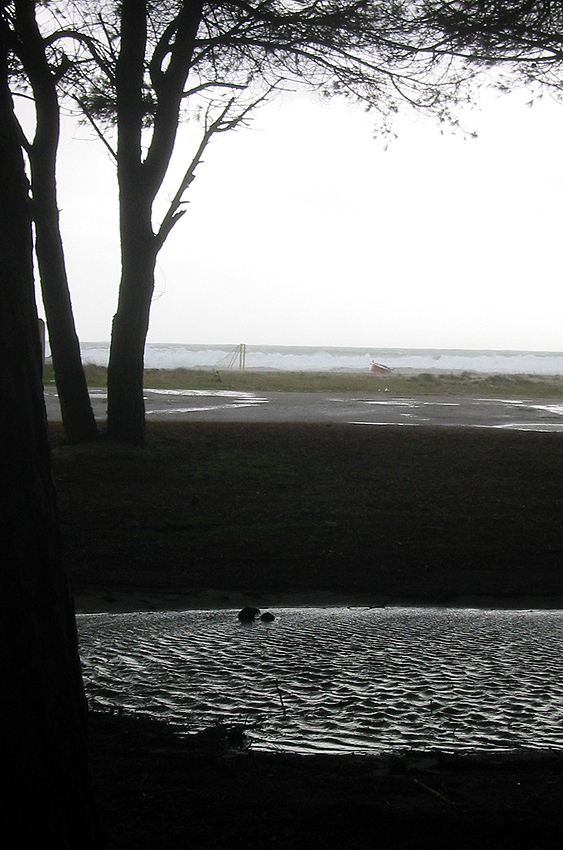 Ottimi spunti, con quella pozza d'acqua increspata a suggerire la forza del libeccio. Peccato che il mare infuriato si vede poco - credo per la stessa foschia generata dalle onde - ma credo non si potesse farci niente se non andando vicino (e allora addio pozza e alberi, elementi portanti della foto - e magari addio anche macchina fotografica, l'aerosol di acqua salata non le avrebbe certo fatto bene).