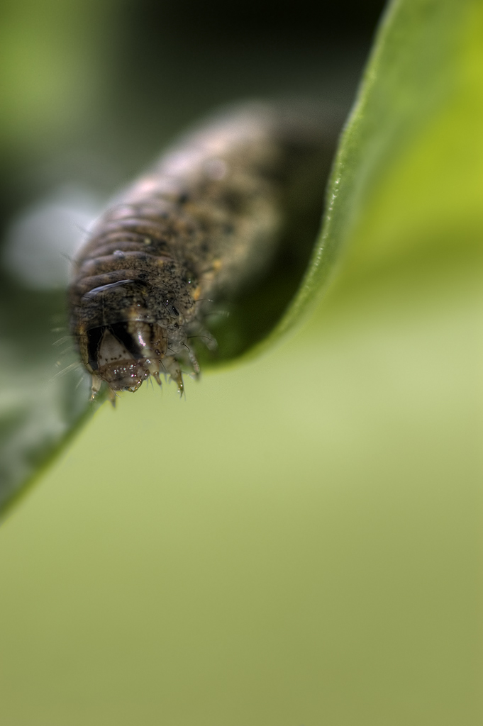 Hai scelto il modo più difficile per fotografare un bruco: così è a fuoco solo il naso, ammesso che i bruchi ne abbiano uno. Disturba la macchia biancastra a sinistra. Bella invece la composizione, con il soggetto in alto che guarda giù nel vuoto verdognolo...
