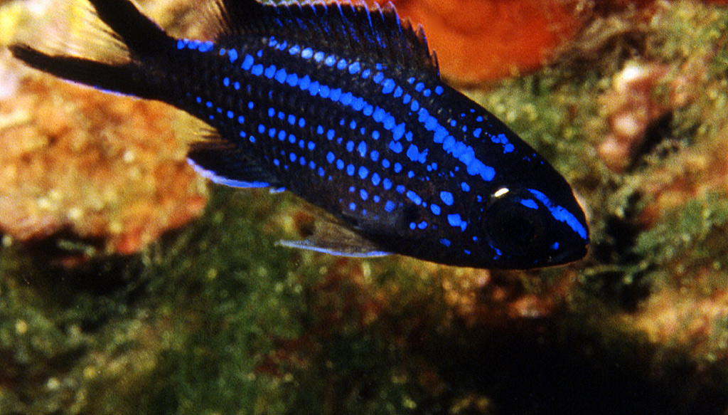 Grazie Roberto, effettivamente la castagnola da piccola è di un bel colore blu elettrico che maschera il nero. Crescendo il pesciolino lascia il blu e assume una colorazione nera perdendo il fascino iniziale.