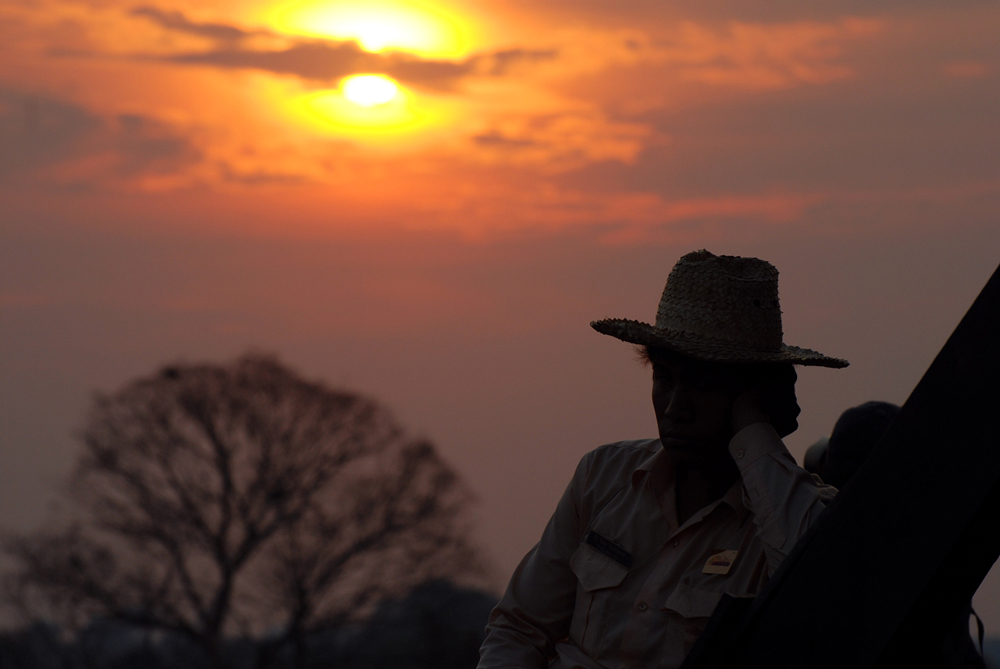 | Il guardiano del tempio Phnom Bakeng si riposa in attesa che i turisti finiscano di fotografare il tramonto con il flash |
