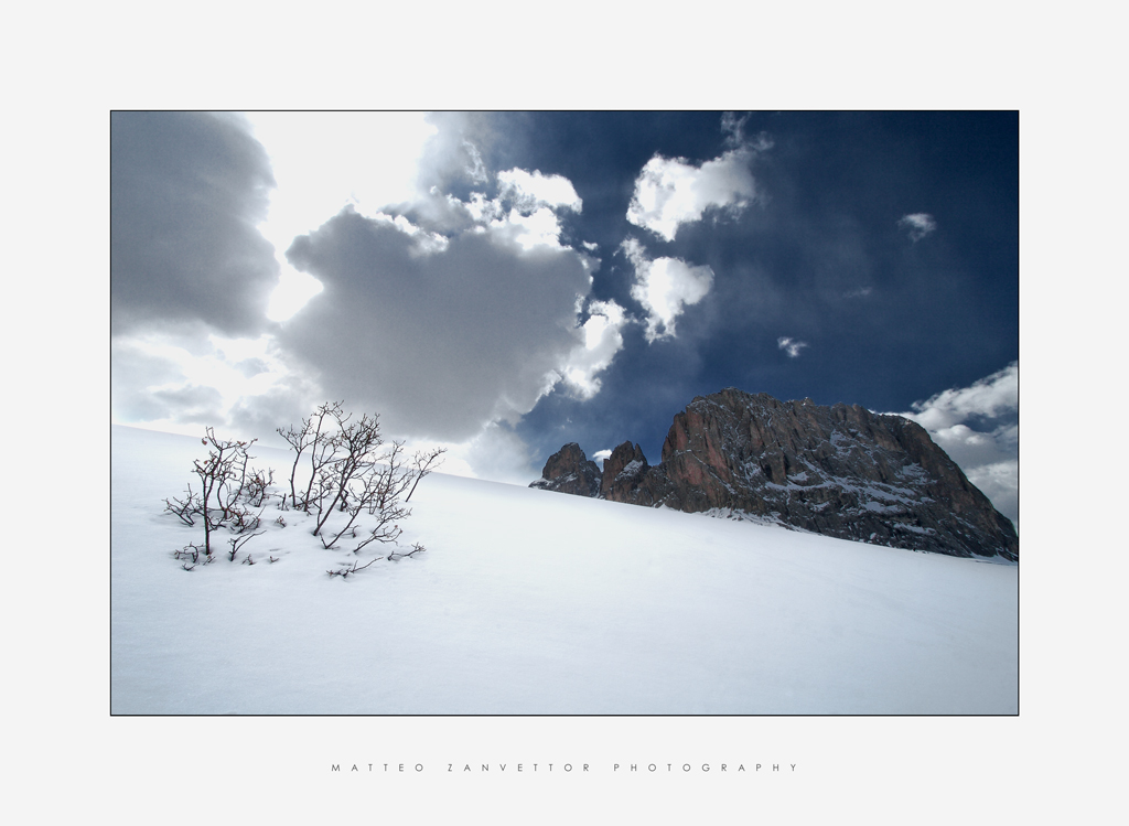 Una immagine su cui lo sguardo vaga e può solo ancorarsi alle scarne presenze vegetali sulla sinistra...con le loro ombre puntiformi ma significative sulla massa informe nevosa..... di apparente pochezza al confronto con la maestosità delle rocce che si ergono a destra. Ma sono due facce della stessa medaglia, due offerte parallele del paesaggio in questo luogo e in questo tempo..... e il cielo in alto, squarciato e cangiante... prende atto con noi della loro realtà....