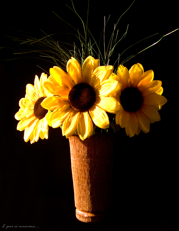Vorrrei solo precisare che si tratta di luce solare proveniente da una finestra posta sulla sinistra (ore 15:30 circa), e si tratta, ahimè, dell'unica fascia oraria nella quale la stanza gode di una buona illuminazione. Inoltre i fiori sono finti. Provando a ridurre l'esposizione, temo che il fiore sulla sinistra vada troppo in penombra (probabilmente dovrei ricorrere a a una fonte supplementare). Ad ogni modo proverò non appena si ripresenteranno le condizioni ottimali a replicare lo scatto.