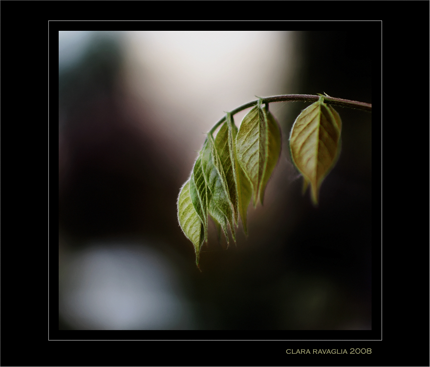 Un semplicissimo rametto che sbuca da un lato, all'interno di una finestra nera; ma la luce accarezza queste giovani foglie, e si intuisce che basterà qualche goccia di pioggia e le foglie, quelle foglie tremolanti, si apriranno alla vita piena.